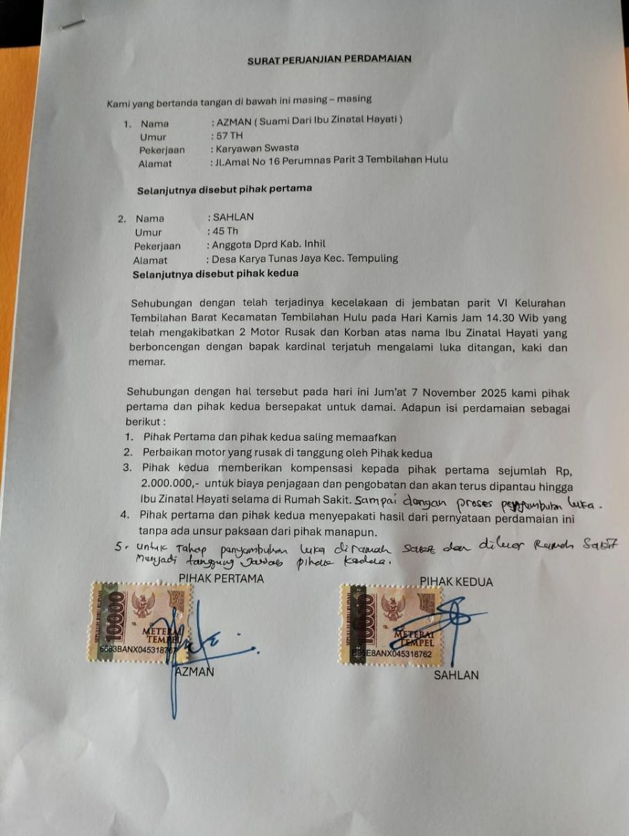 “Alhamdulillah, kami sudah bertemu dengan pihak korban di Tembilahan dan telah menandatangani surat perdamaian. Dalam perjanjian tersebut, khususnya pada poin kelima, kami sepakat bahwa pihak kedua akan menanggung kebutuhan pihak pertama hingga sembuh,” ujarnya.